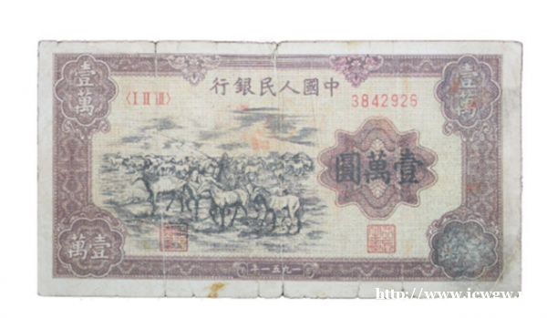 据悉,我国第一版人民币中面值壹万圆“牧马图”发行于1951年5月17日,收回于1955年4月1日,流通时间历经3年11个月;第一套人民币共12种面 额、65种版别,票幅规格140*75mm,票面底纹为网纹,有7位数的号码但无水印,通常采用胶印五色印刷工艺。壹万圆“牧马图”在第一版人民币中被专 家称为“十二珍品”之首